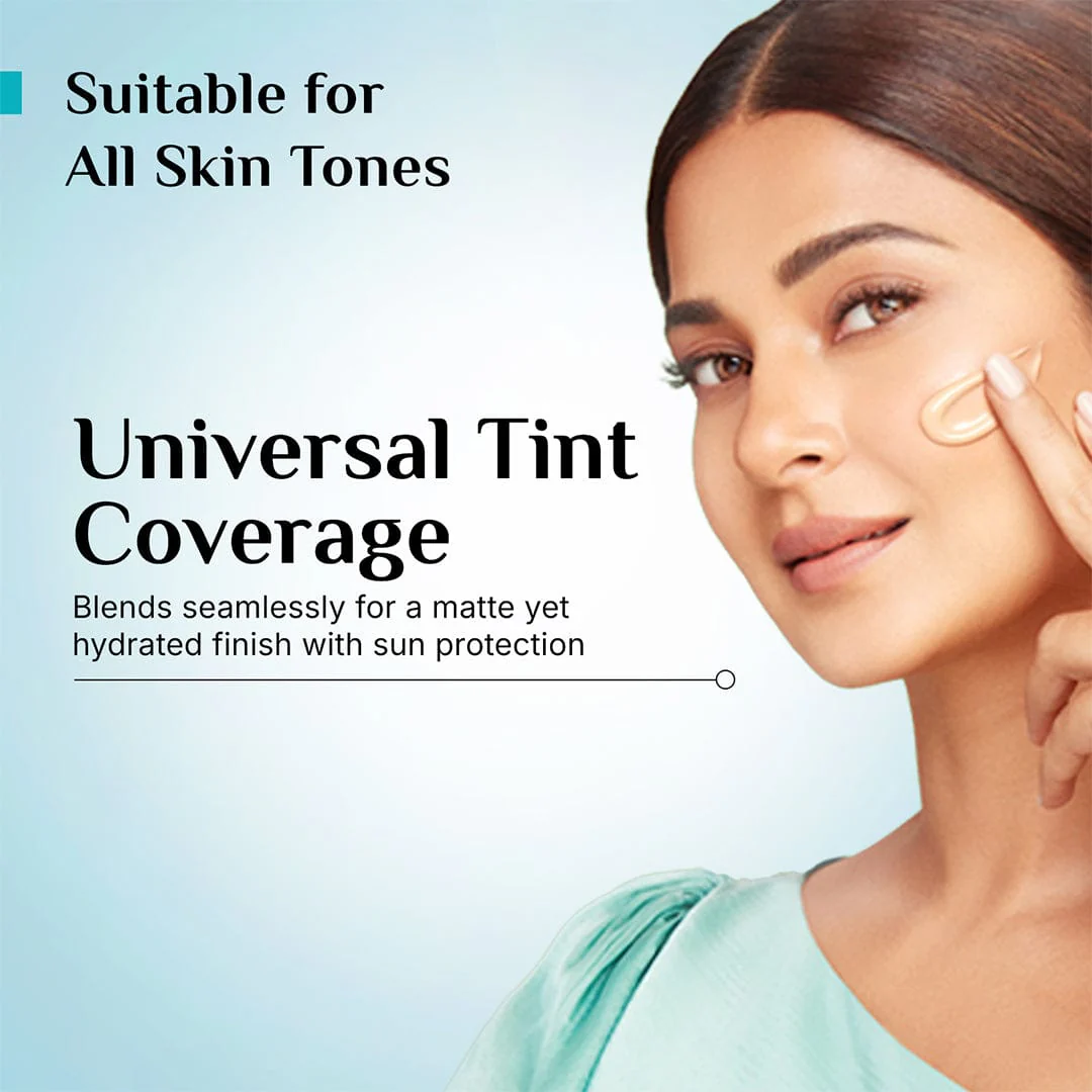 Discover the perfect fusion of skincare and sun protection with the Korean White Lotus Tinted Sunscreen SPF 50+ PA++++. Designed for effortless beauty, this sunscreen not only shields your skin from UVA, UVB, and blue light damage, but also offers an universal tint, light coverage that evens out your skin tone, providing a natural glow. Infused with Korean White Lotus, rich in antioxidants, it deeply nourishes and enhances skin radiance. 3% Niacinamide works to brighten, strengthen the skin barrier, and minimize the appearance of fine lines. Powered by UVShieldX™ Technology, this lightweight, non-greasy formula ensures broad-spectrum protection, preventing tanning, sun damage, and premature ageing. This Korean White Lotus Tinted Sunscreen SPF 50+ PA++++ delivers high-performance sun protection, universal tint, and powerful skincare benefits in one easy application. Say goodbye to white cast, greasy finishes, and heavy makeup—this tinted sunscreen is all you need for the perfect balance of advanced sun protection and natural tint.